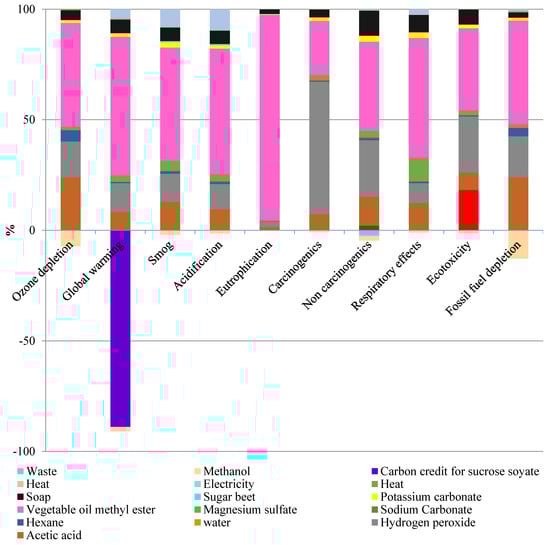 A simplified profile of contributions to environmental impacts of ESS production is depicted in Figure 3. Ten impact categories studied in this assessment were ozone depletion, global warming, smog, acidification, eutrophication, carcinogenics, non-carcinogenics, respiratory effects, eco-toxicity, and fossil fuel depletion. In most categories, vegetable oil methyl ester used for producing sucrose soyate had the largest contribution to the impacts as one of the main inputs for this product. Next, acetic acid and hydrogen peroxide had the most impact among reagents while hydrogen peroxide was the reagent with most carcinogenic impact, with its figure standing at 60% of this category.