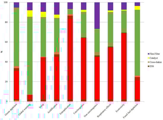 Similarly, we ran a full LCA model for the ESS-based biocomposite production (Figure 4). Results showed that the ESS production step accounts for most environmental impacts in all categories except ozone depletion, global warming and fossil fuel depletion. The cross-linker has the main contribution in these three categories, equal to about 61, 79 and 68%, respectively, over the full life cycle of the biocomposite.
