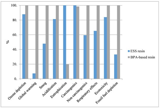 In the next step, we conducted an environmental impact comparison analysis for producing 1 kg of biocomposite made with ESS and 1 kg of a conventional (BPA-based) composite (Figure 6). The resin (Araldite LY 8601) and hardener (Aradur 8602) in composite components were built in the LCA model based on Huntsman’s 2010 product factsheet [23]. Since the exact details of the production process is kept confidential and not published, we used the average amounts of components for building the model. As can be observed from Figure 6, the biocomposite illustrated better environmental impacts in most categories relative to the conventional composite. However, in the ozone depletion category, the biocomposite’s impact surpassed the conventional composite’s impact. The additional 17% higher impact of biocomposite in the ozone depletion category is due to the use of the cross-linker (methyl hexahydrophthalic anhydride) for the preparation of the biocomposite. Changing the cross-linker to one that is functionally similar but with lower environmental impacts can reduce the contribution of this component and improve the life cycle performance of the biocomposite. The inventory for building the LCA model of the cross-linker is provided in Table S3 based on [24,25]. As can be observed, the biocomposite also demonstrated no impact reduction in the eutrophication category. The high impact in this category originates from the production of ESS, as discussed earlier. However, the impact in other categories, such as global warming, smog, non-carcinogenics, and respiratory effects eco-toxicity, was diminished by replacing BPA-based resin in the composite. The conventional composite’s contribution to global warming was 1.78 kg CO2 eq/kg of composite, whereas, the biocomposite’s global warming potential was lower, showing 1.17 kg CO2 eq/kg of biocomposite (over 30% lower). Thus, the decrease in contribution of biocomposite to global warming can be attributed to the biogenic CO2. In the presence of incentives or regulations that address reducing the carbon footprint of products, ESS-based biocomposite can offer a better alternative to the conventional BPA-based composites. The absolute values of contribution for all categories are available in Table S4.