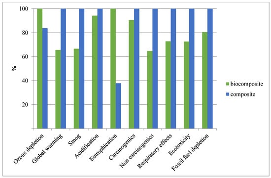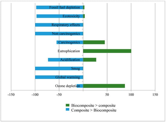 To assess the robustness and transparency of LCA outputs, and to provide better decision-making information, we conducted uncertainty analysis using SimaPro software [16]. The Monte Carlo technique was applied with 10,000 iterations at the 95% confidence level to compare the uncertainty in the biocomposite and petroleum-based composite LCA results (Figure 7). The results display a higher probability for biocomposite outperforming petroleum-based composite in most impact categories. However, biocomposite revealed higher impact in eutrophication and ozone depletion categories with 87.67% and 99.99% probability, respectively. The higher probability of biocomposite exhibiting higher impact in these two categories than composite is compatible with our deterministic results from Section 3.2. High confidence in LCA results can therefore be concluded by this evaluation.
