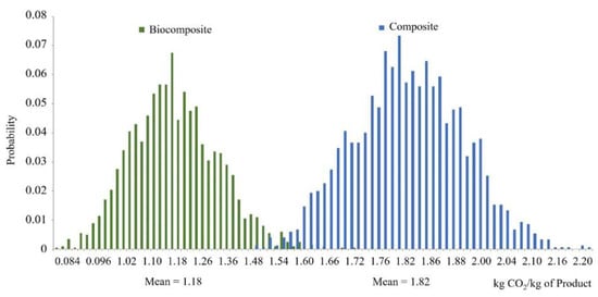 Carbon footprint is the most well-known and common metric to evaluate the performance of bio-based materials in contrast to fossil-based materials. Therefore, we further analyzed the two samples (petroleum-based composite and biocomposite total greenhouse gas (GHG) emissions) to ensure they are statistically different. Figure 8 shows the results of LCA uncertainty model runs for the global warming potential of biocomposite and petroleum-based composite as a probability distribution function. The results of a t-test we performed on the two GHG emission samples demonstrated a p < 0.001, which means there is a significant difference in GHG emissions between the two composites. Thus, petroleum-based composite always has a higher global warming potential (GWP) impact than biocomposite (over 50% higher).