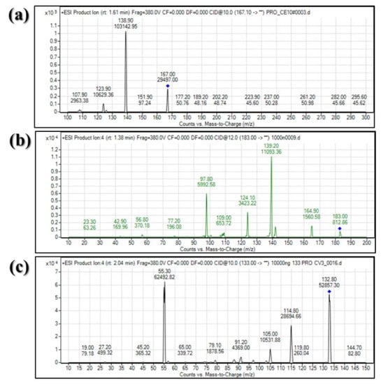 For the optimization of mass spectrometry conditions, both positive and negative ESI modes were investigated. The VD, VA, and internal standard (IS) showed a strong response in the positive mode (Figure 2). The fragment ion for multiple reaction-monitoring (MRM) transition was selected based on MS spectrum intensity. Parent ions for VD, VA, and IS (m/z 167.07, 183.07, and 133.00, respectively) were fragmented at m/z 139.00, 139.00, and 55, respectively (Table 1).