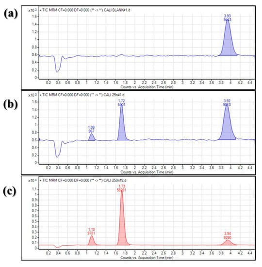 Representative multiple reaction-monitoring (MRM) chromatograms of blank plasma (a); blank plasma spiked with internal standard (IS) (b); 25 ng/mL plasma sample (c); and 250 ng/mL plasma sample.