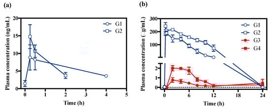 Plasma concentration versus time profiles for veratraldehyde (a) and veratric acid (b) after oral (G1, 300 mg/kg; G2, 600 mg/kg) and percutaneous (G3, 300 mg/kg; G4, 600 mg/kg) administration of veratraldehyde (n = 3).