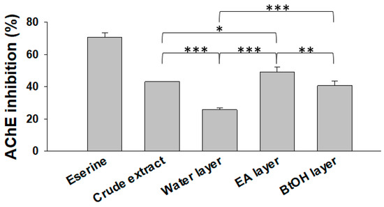 Percentage inhibition of acetylcholinesterase (AChE) activity of Rhodiola rosea root extract and fraction layers. The inhibitory activity was tested using the Ellman method by adding 500 μg/mL extract or a fraction layer, or 2.75 μg/mL eserine. Results are expressed as percentage control and data mean ± SD. Three sets of experiment were performed. EA, ethyl acetate; BtOH, n-butanol. * p-value < 0.05, ** p-value < 0.01, *** p-value < 0.001 compared with one another except eserine.
