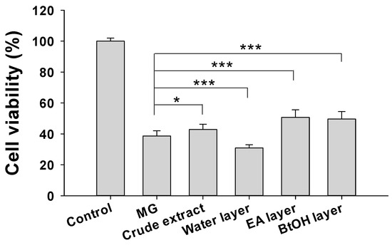 Neuroprotective activity of R. rosea extract and various layers. A concentration of 100 μg/mL R. rosea extract, water layer, or n-butanol (BtOH) layer, or 50 μg/mL ethyl acetate (EA) layer was used against 3.5 mM methylglyoxal (MG) in N2A cells. The cell viability was tested using the WST-8 method. Results are expressed as percentage control and data mean ± SD. Five sets of experiments were performed. * p-value < 0.05, *** p-value < 0.001 compared with the MG-treated group.