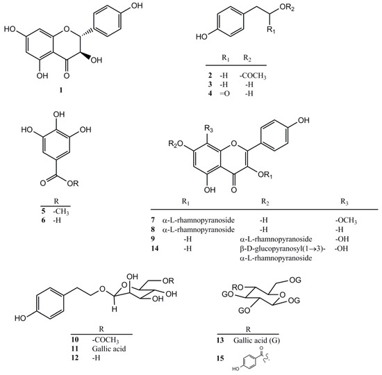 To ascertain the cytoprotective constituents in R. rosea root, we performed a bio-guided purification strategy. The bio-guided fractionation and isolation flowchart (Figure 3) of the ethanol extract of the root of R. rosea resulted in the isolation of 15 compounds (Figure 4). Their structures were elucidated by co-chromatography with one-dimensional and two-dimensional (1D and 2D) NMR, mass spectrometric spectroscopic data analysis, and comparison to the literature. This fraction contained 15 compounds consisting of a flavonoid group, namely, aromadendrin (1) [27], a phenolic group (C6-C2), namely, 2-(4-hydroxyphenyl)ethyl acetate (2) [28], tyrosol (3) [28], 1-O-(4-hydroxyphenethyl)-β-D-glucopyranoside 6-acetate (10) [29], and salidroside (12) [30], a phenolic group (C6-C1), namely, 4-hydroxyphenylacetic acid (4), methyl gallate (5), and gallic acid (6) [31], a flavonoid glycoside group, namely, kaempferol-8-methoxy-3-O-α-L-rhamnopyranoside (7) [32], rhodiosin (14) [33], kaempferol-3-O-α-L-rhamnopyranoside (8) [34], and rhodionine (9) [33], and a tannin group, namely, 6’-O-galloyl salidroside (11) [35], 1,2,3,4,6-penta-O-galloyl-β-D-glucopyranoside (13) [36], and 1,2,3,6-tetra-O-galloyl-4-(4-hydroxy-benzoic acid)-β-D-glucopyranoside (15) [36]. All compounds were evaluated for neuroprotective activity by measuring the viability of N2A cells treated with 3.5 mM MG. Six compounds (3, 4, 6, 7, 11, and 12) have potent neuroprotective activity, while compounds 5 and 8 have some cytotoxicity (Figure 5).