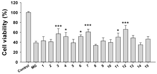 Neuroprotective activity of isolated compounds. The viability of N2A cells treated with 3.5 mM MG and 50 μM of each compound for 24 h was tested using the WST-8 method. Results are expressed as percentage control and data mean ± SD. Four sets of experiment were performed. * p-value < 0.05, *** p-value < 0.001 compared with the group treated with 3.5 mM MG.