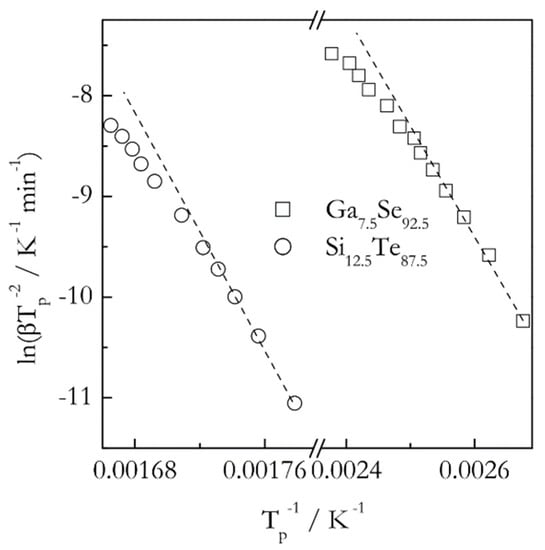 Kissinger plots for crystallization of Ga7.5Se92.5 (squares) and Si12.5Te87.5 (circles) glasses. Dash lines connecting three lowest temperature points are a guide for the eye to better visualize the nonlinearity. The heating rates range from 5 to 90 °C min−1. Data from Abu El-Oyoun [41,42].
