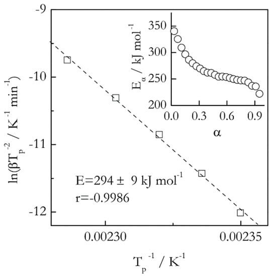 where E1 is the activation energy of the forward reaction, ΔH0 is the reaction enthalpy and P is the partial pressure of the gas product. According to Equation (10), E should decrease with increasing temperature because P0 increases, making the second addend increasingly smaller. Clearly, none of that information can be gained from the single value 82 ± 1 kJ mol−1 estimated by the Kissinger method (Figure 2).