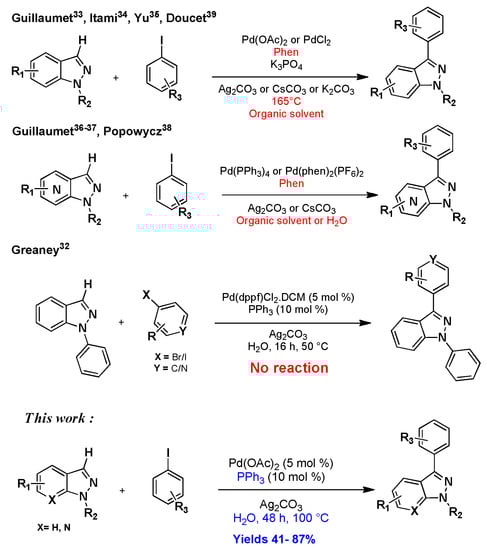 1H-indazoles and 2H-indazoles have widespread utility as highly bioactive molecules [28]. For such reasons, various researchers were inspired to develop and optimize new methods for their synthesis and functionalization [29,30,31,32]. Recently, different research groups have investigated the C3 direct arylation of indazole, including our own. In 2012, our group [33] in parallel with the Itami group [34] developed, for the first time, conditions to realize the direct arylation of 1H-indazole series. The key of this success was the use of bidentate ligand (1,10-phenanthroline) with a high catalyst loading (10 to 20 mol%). Later, the reaction conditions have been optimized by the Yu group by reducing catalyst and ligand loading [35]. In this report, only one example of C3 arylation of 1H-7-azaindazole was reported using Pd(OAc)2 as a catalyst, and Phen as a ligand in toluene at 160 °C (Scheme 1). Very recently, our group [36,37] and later Popowycz’s [38] group reported independently that the C3 direct arylation of azaindazoles was feasible but using again 1,10-phenanthroline (Phen) as a crucial ligand in the case of 1H series for both 4-azaindazoles and 7-azaindazoles. In 2017, Doucet and his group reported a phosphine free C3 arylation of 2H-indazoles in dimethylacetamide DMA using 5 mol% of Pd(OAc)2 as catalyst at 150 °C [39]. We noticed in their report that the C3 direct arylation of 1H-indazole was feasible for the first time without the use of bidentate ligands by employing PdCl(C3H5)(dppb) as catalyst and KOAc as base in DMA at 150 °C. Nevertheless, the expected products were obtained in moderate to low yields, and the reaction was achieved in organic solvent. It is noteworthy that all the reported methods on C3 arylation of 1H-indazole discussed above were carried out in organic solvents and at high temperatures. In 2010, Greaney et al. [32] reported that 2-phenyl-2H-indazole could be directly arylated at the C3 position in high yields using aryl bromides as coupling partners on water in the presence of Pd(dppf)Cl2 (5 mol%) and Ph3P (10 mol%) as catalyst and ligand, respectively. Unfortunately, under these reaction conditions, the authors failed to achieve direct arylation on 1-phenyl-1H-indazole, yet they concluded that, in this case, the C3 position is non-reactive toward substitution.