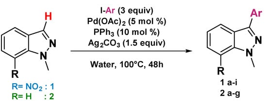 A 5 mL sealed tube was charged with 1-methyl-7-nitro-1H-indazole 1, 1-methyl-1H-indazole 2, 1-phenyl-1H-indazole 3, or 1-benzyl-1H-pyrazolo[3,4-b]pyridine 4 (1.0 equivalent), iodoaryl (3.0 equivalent), Pd(OAc)2 (0.05 equivalent), PPh3 (0.1 equivalent) and Ag2CO3 (1.5 equivalent). The mixture of solids was stirred for a few seconds to ensure all solids were well mixed. Then, 3 mL of distilled water was added, the mixture was degassed for few minutes, and the vial was covered with a serum cap. Then, the vial and its contents were heated and stirred at 100 °C for 24 h. After it was cooled to room temperature, the mixture was filtered through celite, and the organic phase was extracted three times with ethyl acetate, dried over magnesium sulfate, and then concentrated under reduced pressure. The residue was purified by flash chromatography to provide the desired products.