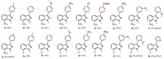 Scope and limitation of the ‘’on water’’ direct arylation of 1-methyl-7-nitro-1H-indazole and 1-methyl-1H-indazole. a Percent of recovered starting material, b 72 h.