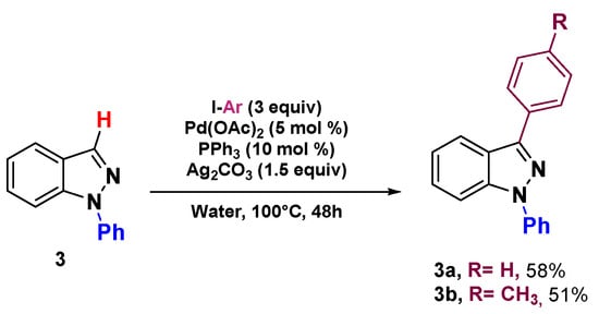 Firstly, we tested Greaney’s reaction conditions [Ag2CO3 (1 equivalent), PPh3 (10 mol%), Pd(dppf)Cl2·DCM (5 mol%), 4-iodotoluene (1.1 equivalent), water at 50 °C for 16 h] [32] on 1-methyl-1H-indazole 1. The arylation reaction did not occur, and only starting material 1 was recovered (Table 1, entry 1).