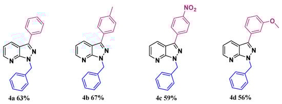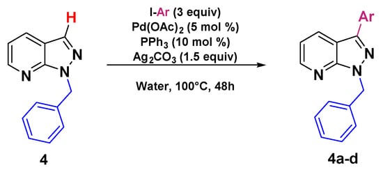 After succeeding in developing a “greener” pathway to synthesize C3-arylated 1H-indazole, we extended the methodology to prepare C3-arylated pyrazolo[3,4-b]pyridine, also known as azaindazole, which is an 1H-indazole isostere and is often used as a key pharmacophore in drug design [42,43,44,45,46,47,48,49,50,51,52,53,54,55,56,57]. Despite the enormous biological interest of C3-arylated pyrazolo [3,4-b]pyridines, only one work has been reported by Lavard and Popowycz [38], addressing the functionalization of this motif via direct arylation. Although this reported method is efficient, it is relatively energy-wasting, using heating at 160 °C for a long period of 3 days and organic solvent. For this reason, we decided to test our conditions developed to prepare C3-arylated pyrazolo[3,4-b]pyridine using the starting material 4 containing a benzyl group (the preparation of starting material 4 is described in the Supporting Information) with various aryl iodides as arylating partners. As expected, this procedure also showed a very high tolerance to various substituents on the aryl rings and the arylated products 4b–d were isolated with yields ranging between 56 and 67% (Scheme 4).