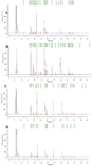 The gas chromatography (GC) chromatograms of rosemary’s volatile oils obtained from fresh (A), one-week dried (B), two-weeks dried (C), and three-weeks dried (D) herbs showed major differences in the number of peaks and their relative intensities in rosemary oil batches.