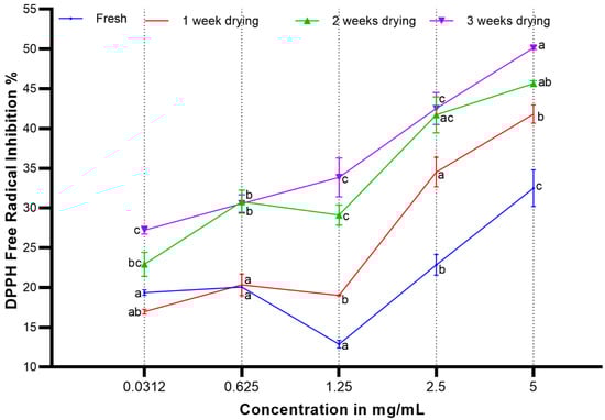 The antioxidant activity levels of rosemary oils agent DPPH-stable free radical tests for the fresh herbs (zero dryings), one-week, two-weeks, and the three-weeks dried herbs oil’s DPPH reactivity. The statistical significance of the two-way ANOVA was p < 0.0001. Tukey’s multiple comparisons were then performed for all the different concentrations. Different letters within the same concentration denote significant differences among the groups according to Tukey’s test (p < 0.01).
