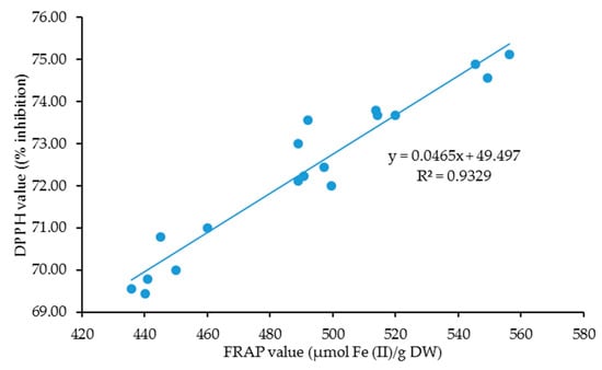 The correlation between DPPH value (% inhibition) and FRAP value (µmol Fe (II)/g DW) for a combination of both harvesting age and harvesting frequency.