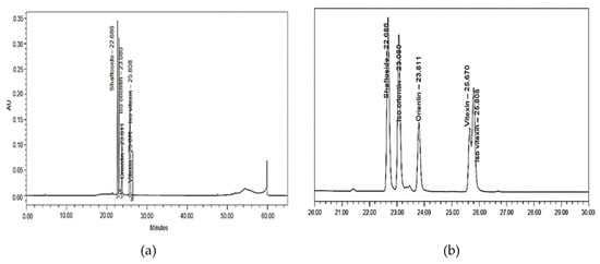 HPLC chromatogram of the standard solution in (a) full and (b) zoom. Shaftoside (RT: 22.686), iso-orientin (RT: 23.080), orientin (RT: 23.811), vitexin (RT: 25.670), and iso-vitexin (RT: 25.808). RT refers to retention time.