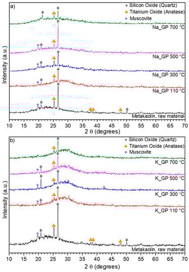 Figure 1 shows the XRD patterns for metakaolin (Argical M 1200S) and the geopolymer powders (sodium-based geopolymer, Na-GP and potassium-based geopolymer, K-GP) prepared for the study. The metakaolin pattern presented the typical amorphous hump for 2θ = 15–30°, while the most evident peaks, between 20° and 25°, corresponded to the crystalline forms of silicon oxide (quartz), titanium oxide (anatase) and muscovite. In Figure 1a,b, we can observe that samples Na-GP and K-GP, treated at four temperatures (110, 300, 500 and 700 °C), possessed completely amorphous structures: the only peaks detected were derived from impurities contained in the metakaolin raw material and corresponded to the above mentioned crystalline phases of quartz (2θ = 20.70° and 26.50°), anatase (2θ = 25.14°) and muscovite (2θ = 19.60°). Such impurities do not take part in the geopolymerization reaction, so they remain in the final geopolymer’s composition [18].