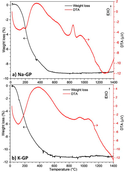 Figure 2 shows the results of the thermal analysis performed on the geopolymers after curing. For the Na-GP, there is an endothermic peak at approximately 110 °C, corresponding to the removal of physical water (Figure 2a). An exothermic peak is clear at around 350 °C, corresponding to the polycondensation into siloxo bonds of the unreacted phase in the geopolymer powder [11]. At around 850 °C, we can observe another exothermic peak, corresponding to the crystallization of the geopolymer phase. Crystals of nepheline (NaAlSiO4) usually form at this temperature. As the Na-GP powders were only treated up to 700 °C, it was confirmed that they did not develop any relevant crystalline phase. At 1300 °C, a small exothermic peak is present, probably due to the partial melting of the material. It is possible to correlate the first peaks of the DTA (Differential thermal analysis) curve with the largest weight loss, corresponding to approximately 9% at 550 °C, attributed to the release of water species within the tridimensional geopolymeric network. The total weight loss was 9.3% and remained constant with increasing temperature.