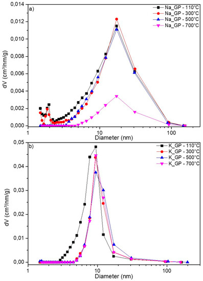 It is worth noting that the mesoporosity of geopolymer materials is due to the polymerization reaction (polycondensation of aluminosilicates), which produces water that is later removed by evaporation. At the nanometer scale, the porosity is due to the morphology of the phases, which is based on the aggregation of spheroidal nano-sized particles [11]. The pore size distributions of the Na-GP and K-GP geopolymers are shown in Figure 3 and corroborate the data in Table 1. Sample Na-GP presented mesopores (2 nm < diameter < 50 nm), with an average pore diameter of ~17 nm and a small amount of micropores (diameter < 2 nm). However, after the heat treatment at 700 °C, the sample lost most of its micro- and meso-porosity. The total pore volume decreased from 0.3 to 0.08 cm3/g, (Table 1), in agreement with the decrease in SSA, as previously discussed. The sample K-GP maintained a total pore volume of ~0.3 cm3/g with the increasing temperature, since potassium promotes lower thermal shrinkage than sodium; nevertheless, the K-GP sample had a smaller average pore diameter, at ~9 nm, with no micropores present (Figure 3b).