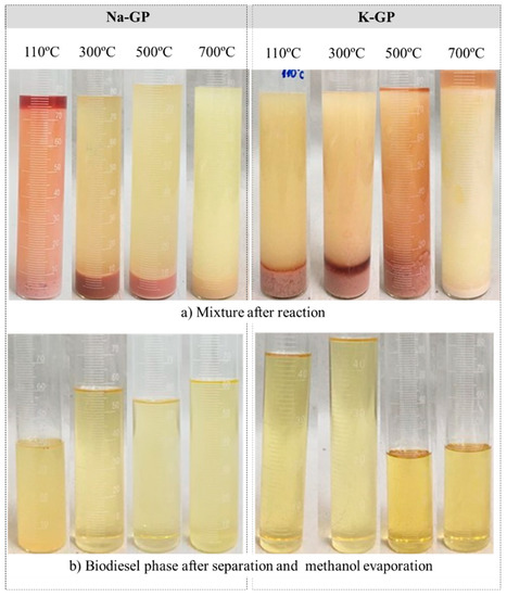 Figure 4 shows the details of the post-reaction mixtures and the biodiesel phase after the evaporation of the excess methanol. All the phase and color features that have been previously discussed are present. We can observe in Figure 4a that samples Na-GP, treated at 100 °C, and K-GP, treated at 700 °C, both presented a clear third top phase typical of non-reacted methanol and a low biodiesel yield. On the other hand, Na-GP treated at 700 °C presented only a single light liquid phase, with the catalyst settled at the bottom. The best visual results were those of the Na-GP samples treated at 300 and 500 °C and K-GP treated at 110 and 300 °C, all with a clear reddish bottom glycerol phase. Figure 4b shows samples of the biodiesel phase after evaporation. The light yellow color is typical of biodiesel which has been processed with soybean oil.