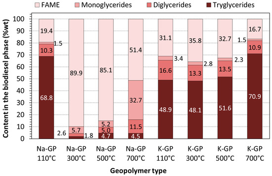 The results confirmed the visual features of the post-reaction mixtures shown in Figure 4. On average, the sodium-based geopolymer powders produced a clearly higher FAME (Fatty Acid Methyl Ester) content than the potassium-based samples. Except for the sample treated at 110 °C, Na-GP provided a relatively high FAME content that reduced from 89.9% to 51.4% as the treatment temperature increased from 300 to 700 °C. It is worth noting that, even for the Na-GP treated at 700 °C, there was a great amount of monoglycerides (32.7%) and very low amount of triglycerides (4.5%), the initial raw material needed for transesterification. This confirms the progress of the reactions ((Equations (1)–(4)) and indicates that a higher FAME content would be achieved for longer reaction times with all Na geopolymers. On the other hand, the K-based geopolymers did not present a clear trend with the treatment temperature but produced consistent levels of FAME content. The chromatogram profiles of Mono, Di and Triglycerides, and the chromatogram profile of biodiesel (FAMEs) are shown in the Supplementary Materials.