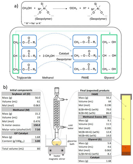 (a) Schemes of methoxide formation and transesterification reaction; (b) recipe for methyl transesterification of soybean oil and expected products using Na and K geopolymer catalysts.