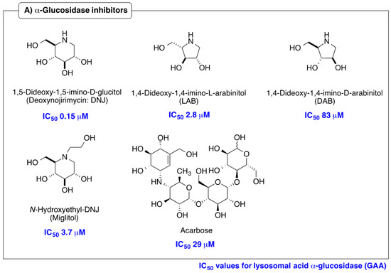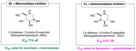 Structures and glycosidase inhibition of piperidine and pyrrolidine iminosugars, and acarbose. (A): α-glucosidase inhibitors. (B): α-mannosidase inhibitor. (C): α-galactosidase inhibitor.