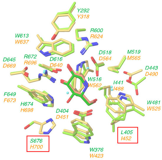Structural overlap of lysosomal acid α-glucosidase (GAA) (light green) and endoplasmic reticulum (ER) α-glucosidase II (yellow) at the deoxynojirimycin (DNJ) binding site. Upper light green: amino acid residues of GAA. Lower yellow: amino acid residues of ER α-glucosidase II. Amino acid in a box: uncommon amino acid residues.