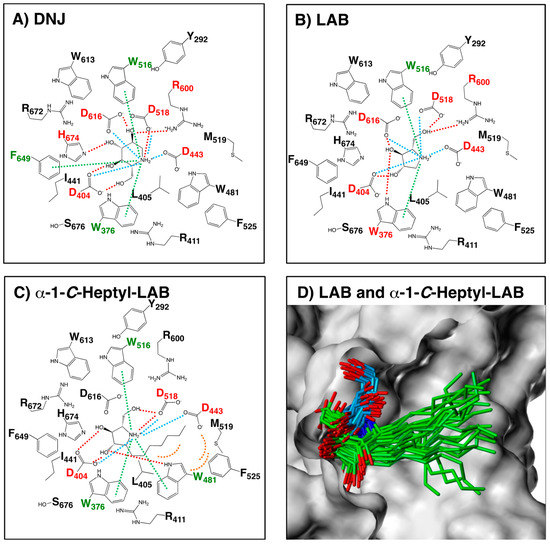 Schematic diagram of the interactions between GAA and (A) DNJ, (B) LAB and (C) α-1-C-heptyl-LAB. DNJ: the complex crystal structure (PDB ID: 5NN5). LAB and α-1-C-heptyl-LAB: the complex structure showing the best binding energy among 50 complex structures obtained from MD simulations. The red dashed lines represent hydrogen-bond interactions. The green dashed lines represent cation-π interactions. The blue dashed lines represent ionic interactions. The orange arcs (dashed line) represent hydrophobic interactions. The labels of amino acids involved in the hydrogen-bonding and the cation-π interactions are colored in red and green, respectively. (D) The 25 binding poses of LAB (blue) and α-1-C-heptyl-LAB (green) obtained from the MD simulations. The molecular surface of GAA is displayed using Sybyl-X 2.2.1 (Certara USA, Inc., Princeton, NJ, USA).