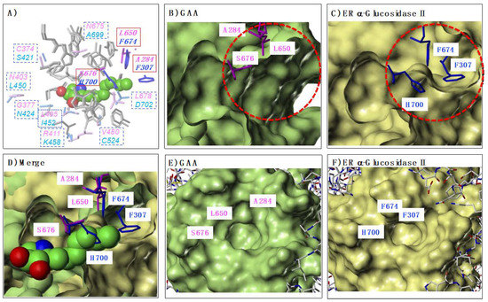 On the basis of these findings, we hypothesized that the difference in the storage sites of the alkyl chains would also affect the selectivity of GAA and ER α-glucosidase II. Based on this hypothesis, we first identified each storage site (Figure 7). At first, the crystal structures of GAA (PDB ID: 5NN5) and ER α-glucosidase II (PDB ID: 5IEE) were superposed using the Protein Structure Alignment tool in Maestro. Subsequently, the complex structure of each enzyme with α-1-C-hexyl-LAB was extracted from the MD simulation and superimposed on them (Figure 7). Figure 7A showed the amino acids of GAA and ER α-glucosidase II within 5Å surrounding the α-1-C-hexyl-LAB. The amino acids that differ between GAA (magenta) and ER α-glucosidase II (blue) were displayed in the square box. As shown in Figure 2, the amino acid residues surrounding the sugar recognition site of both enzymes were almost common. In sharp contrast, it was revealed that the amino acid residues surrounding the α-1-C-hexyl-LAB binding part in each active site was clearly different. We focused especially on three amino acids: Ala284, Leu650, and Ser676 (red solid square box), which composed the LAB-alkyl chain storage pocket. In case of ER α-glucosidase II, these amino acids were replaced by Phe307, Phe674, and His700. As shown in Figure 7B,C, the substitution of these three amino acids causes a large difference in the opening part (red dotted circle) of each active site. Similarly, from the view of the outside of the opening, it can be seen that GAA has a wider opening than ER α-glucosidase II (Figure 7E,F). Figure 7D showed the superimposition of both protein surface. Consequently, the space of the alkyl chain storage pocket in ER α-glucosidase II was narrower than GAA, and it cannot accommodate the extension of alkyl chains.