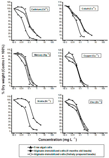 The metal ion showing the second greatest toxicity to the growth of P. subcapitata was Co2+. Even at the lowest concentrations, cobalt reduced algal growth, being significantly more toxic to free (EC50 = 0.03 mg L−1) than to immobilized (EC50 = 0.061 mg L−1) cells (p ≤ 0.001). Cobalt concentrations of 0.32 mg L−1 and 1.0 mg L−1 completely inhibited the growth of free and immobilized cells, respectively [28].