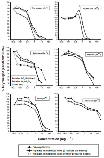 Lead concentrations below 0.320 mg L−1 were found to have little or no effect on the growth of free algal cells, but significantly stimulated the growth of immobilized algae. Further increases in Pb2+ concentration, however, caused significant growth inhibition. Pb was significantly more toxic to free (EC50 = 3.3 mg L−1) than to alginate immobilized (EC50 = 5.0 mg L−1) cells (p ≤ 0.05), with the growth of both cultures completely inhibited at Pb concentrations of 32.0 mg L−1 [41,75].