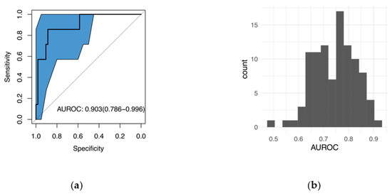 (a) Receiver operating characteristic (ROC) curve for classifying melanoma vs. pigmented lesions. The area under the ROC curve (AUROC) of 0.903 means high accuracy in distinguishing melanoma from pigmented lesions. The blue shade shows the 95% confidence interval for the ROC. (b) The histogram of AUROC from 99 randomization tests, where 7 out of 60 lesions were randomly assigned to the “melanoma” group. There is only a small chance (1%) that the observed AUROC is greater than 0.9 for the randomization tests, which suggests that the high AUROC is mostly likely due to real differences between melanoma and pigmented lesions.