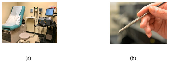 (a) Optical instrument system for clinical data acquisition in the clinic examination room. (b) The handheld fiber probe enables acquisition of Raman spectral data.