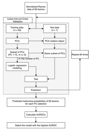 Figure 3 shows the data analysis pipeline, which was conducted in MATLAB (R2019b, MathWorks, Natick, MA, USA). We used principal component analysis (PCA) and built logistic regression classifiers with leave one lesion out cross validation, and receiver operating characteristic (ROC) curves were used for accuracy evaluation. Normalized Raman data were used as inputs for PCA. PCA was used because there were 1980 wavenumbers between 800 and 1790 cm−1 for our Raman data and adjacent wavenumbers were correlated. PCA is able to reduce the dimensionality dramatically by providing the principal components (PCs), which capture the most variance of the original data. Logistic regression models are appropriate for binary classification tasks. Leave one lesion out cross validation was used to validate the performance of the PCA and logistic regression models by leaving one lesion out each time to train the models. PCA was applied to the training dataset, and the same transformation using the calculated coefficients (PCA rotation object) from the training dataset was applied to the test dataset. A subset of PCs was used as input features for logistic regression models and the probability for each left out biopsy was calculated in the whole cross validation process. ROC curves were then calculated based on the posterior probabilities of all lesions and used to evaluate the performance of classification. The ROC curve with confidence intervals was plotted in R (Version 1.2.5033, RStudio, Boston, MA, USA).