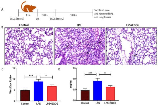 EGCG reduced histopathological damage and oedema in lipopolysaccharide (LPS)(IT)-induced lung. (A) Schematic to perform mice experiments for the study. (B) Representative histological slides of the lungs of designated groups (H&E staining, 10×). Enhanced inflammatory cells infiltration in the alveolar area of the lung in the LPS-instilled group when compared with the control group. Administration of EGCG suppressed infiltration of cells and less dense histoarchitecture of lung tissue. (C) Wet/dry ratio was significantly enhanced after LPS instillation, administration of EGCG significantly inhibits LPS-induced lung wet/dry ratio. (D) Total protein of bronchoalveolar lavage (BAL) fluid was measured after 18 h of acute lung injury (ALI) induction in different treatment groups. Significant upregulation in BAL protein levels after LPS(IT) instillation, treatment of EGCG suppressed this increased protein levels. Significant difference * p < 0.05 and *** p < 0.001.