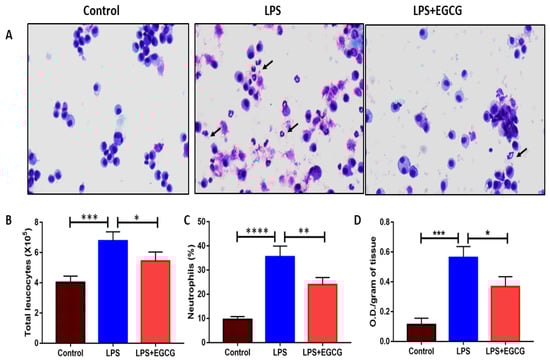 The mice were hosted in compliance with the international guidelines of laboratory animal care, and the procedures on animals were approved by the Institutional Animal Care and Use Committee of College of Applied Medical Sciences, Qassim University (File Number: 1-14-S-3932). Animals were housed in standard cages and during this time, they had free access to food and water. The experimental mice were separated into three groups: (1) PBS-instilled control, (2) LPS-instilled (2 mg/kg body weight) and (3) LPS + EGCG (15 mg/kg). The 15 mg/kg EGCG was administered IP injection for twice and 50 μL of LPS (2 mg/kg) or PBS were-instilled intratracheally to induce acute lung injury. The mice were sacrificed 18 h after the LPS treatment using ketamine/xylazine, and then the bronchoalveolar lavage fluid (BALF) was harvested using chilled PBS (10 mL.X3). The BAL fluid was centrifuged, and one part of cells was stained with Trypan blue and counting was done using a haemocytometer to determine the total leukocyte count. Remaining cell pellet resuspended again with PBS and cytospin centrifuge was used to prepare a single layer of BALF cells, which were stained with HEMA stain (Thermo Fisher Scientific, Waltham, MA, USA). The supernatant was used to perform cytokines and MPO quantifications. The lung tissue was fixed in 4% neutral buffered formalin (Sigma-Aldrich, MO, USA), embedded in paraffin, and performed sectioning using microtome [44].