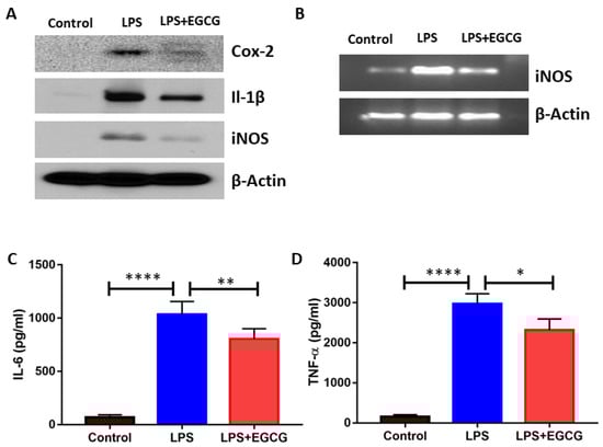 Effects of EGCG on LPS-induced M1 inflammatory mediators. (A) RAW cells were stimulated with LPS in the presence or absence of EGCG for 24 h and proinflammatory markers were analysed. Immunoblots of COX2, iNOS and iL-1β demonstrated suppressed activity of these proteins by EGCG in macrophages. (B) iNOS mRNAs were measured using RT-PCR (C) The BAL TNF-α secretion increased in the LPS-instilled group and declined after EGCG treatment. (D) The LPS also increased IL-6 secretion and the EGCG treatment controlled the LPS-induced secretion. Significant difference * p < 0.05, ** p < 0.01 and **** p < 0.0001 The data are expressed as mean ± SEM. (n = 4 or more animals per group).