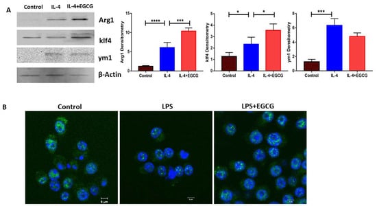 Effects of EGCG on IL-4-induced M2 polarisation. (A) RAW cells were stimulated with IL-4 in the presence or absence of EGCG for 24 h and M2 markers were analysed. Immunoblots of Arg1, KLF4 and ym1 demonstrated enhanced expression of these proteins by EGCG in macrophages. (B) KLF4 immunofluorescence was demonstrated LPS-induced downregulation, which was enhanced after EGCG incorporation (n = 3 or more). Significant difference * p < 0.05, *** p < 0.001 and **** p < 0.0001.