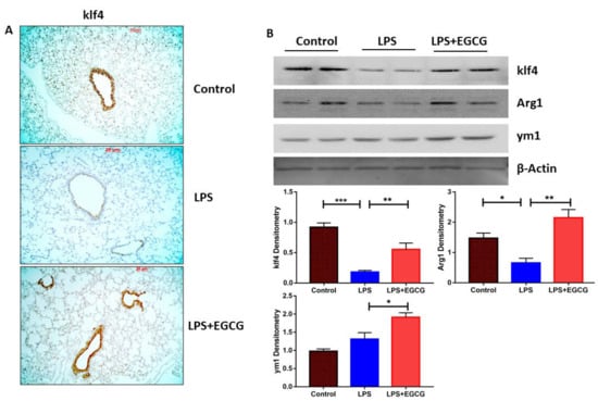 Macrophages are polarised into two phenotypes, specifically, classically activated (M1) inflammatory phenotype and alternatively activated (M2) anti-inflammatory cells. LPS is well-known to polarise macrophages toward M1 inflammatory phenotype and reducing M2 phenotype [6]. So, we investigated whether EGCG affects LPS-induced polarisation of macrophages into the inflammatory M1 phenotype in lung macrophages. Our experiments found that EGCG treatment reduced LPS-induced M1 proinflammatory markers, including iNOS, Il-1β and Cox-2 in RAW264.7 (Figure 3A). EGCG treatment also effectively decreased LPS-induced iNOS at the mRNA level in macrophages (Figure 3B). LPS treatment additionally directed to enhance secretion of IL-6 and TNFα, which are well capable of converting lung microenvironment towards M1. Injection of EGCG significantly reduced the concentration of these cytokines (Figure 3C,D), helping to achieve a normal lung microenvironment. We then examined the effect of EGCG on IL-4-induced M2 polarisation markers in RAW macrophages. IL-4 treatment led to augmented expression of M2 marker, specifically Arg-1 and ym-1, which were further increased after EGCG treatment (Figure 4A). KLF4 is a well-known transcriptional regulator of macrophage polarisation and polarise macrophages toward M2 phenotype [13]. So, next, we examined the expressions of KLF4 in macrophages and lung tissues of LPS- and/or EGCG-treated mice. We found enhanced expression of KLF4 in EGCG + IL-4-treated group as compared to IL-4 alone treatment (Figure 4A). A similar trend in KLF4 expression was also observed after immunofluorescence staining of RAW macrophages (Figure 4B). Consistent with the results obtained using RAW cells, we obtained the expression of KLF4 in the LPS-induced ALI was diminished in lung immunohistochemistry, but the treatment of EGCG significantly enhanced expression of KLF4 in lung tissues (Figure 5A). As expected, immunoblots of other M2 markers like Arg1 and ym1, along with KLF4, were also improved in EGCG-treated lung tissues as compared to the LPS-instilled group (Figure 5B). Here, we can depict that EGCG can modulate macrophage polarisation enhancing the expression of KLF4.