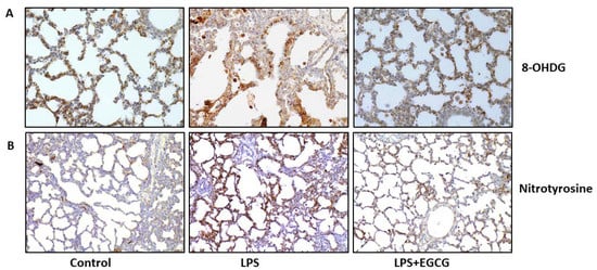 8-hydroxydeoxyguanosine (8-OHdG) is one of the most commonly used markers of oxidative damage [20]. In this study, the results showed that LPS significantly elevated staining of 8-OHdG in mice lung which was reduced after administration of EGCG (Figure 6A). Nitrotyrosine is a marker of nitrosative stress [21], was significantly increased in the lungs of LPS-instilled mice, treatment with EGCG significantly reduced LPS-induced nitrotyrosine immunostaining in mice lung compared to controls (Figure 6B).