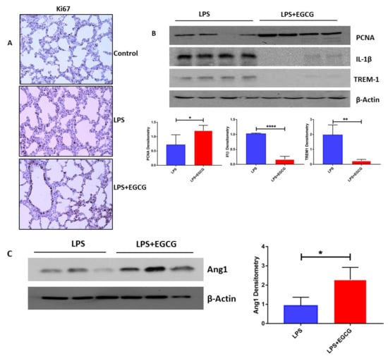 Ki67 and PCNA are markers of cell proliferation and normally expressed within the active dividing cells of bronchial and alveolar lining cells. While in the animals which had undergone LPS-induced ALI, Ki67 was fairly decreased in bronchial and alveolar tissues although EGCG injections improved lung Ki67 immunostaining (Figure 7A). PCNA protein expression was also increased after EGCG injection as compared to the LPS-treated control group (Figure 7B). TREM-1 is a known amplifier of inflammation, specifically expressed in myeloid cells [22,23]. TREM-1 expression was reduced in the LPS + EGCG-treated group as compared to the LPS-alone-treated control group (Figure 7B). Similarly, IL-1β protein expression was also reduced after EGCG treatment in LPS-induced ALI (Figure 7B). Modulation of TREM-1 and IL-1b showed anti-inflammatory potential of EGCG in ALI. Angiopoetin-1 (Ang-1) plays a protective role in ALI and enhanced Ang-1 expression in endothelial or epithelial cells were shown beneficial in different lung injury models [24]. EGCG treatment effectively enhanced Ang1 protein expression in LPS-instilled lung injury model as compared to LPS control (Figure 7C).