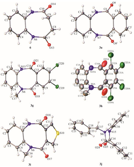 Attempts to obtain single-crystals suitable for X-ray diffraction measurements were undertaken for all synthesized compounds. However, they were only successful in nine cases (3a, 3g–3j, 6, 9a, 9c and 10). Single crystals appropriate for this purpose were grown by slow evaporation from: 3a—DMSO:DMF (1:1), 3g—n-butyl acetate, 3h—ethanol, 3i—THF:water (9:1), 3j—ethanol, 6—DMF, 9a—DMSO:NMP (1:1), 9c—dimethylacetamide (DMA), 10—ethanol.