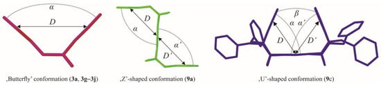 The graphical representation of the conformation types of molecules of investigated tri- and pentacyclic compounds with geometrical parameters used for their description.