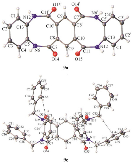Compound 3j was treated with 2-chloro-N,N-dimethylethan-1-amine, in the presence of sodium hydride, which resulted in the formation of 5-benzyl-12-(2-(dimethylamino)ethyl)-5,12-dihydrodibenzo[b,f][1,4]diazocine-6,11-dione (3m). In a similar way, the treatment of 3g with ethyl bromoacetate led to the formation of ethyl 2-(8,9-dichloro-12-methyl-6,11-dioxo-11,12-dihydrodibenzo[b,f][1,4]diazocin-5(6H)-yl)acetate (3n) (Scheme 3). The heating of 3j in acetic anhydride at reflux temperature gave the N-acyl derivative, 5-acetyl-12-benzyl-5,12-dihydrodibenzo[b,f][1,4]diazocine-6,11-dione (3o). We also attempted to alkylate the pentacyclic derivative 9a by treating it with methyl iodide or benzyl bromide in the presence of sodium hydride (Scheme 4), which resulted in the tetramethyl derivative 9b and tetrabenzyl derivative 9c. The 1H NMR spectrum registered for 9a indicates the presence of two conformational isomers in the ratio of 1:0.25, which can be deduced from two sets of signals originating from NH and Ar-H protons. These conformers are the result of dihydrodiazocine-6,11-dione rings being able to adopt two possible orientations, leading to a ‘U’-shaped or a ‘Z’-shaped molecule, as seen in the crystal structures of compounds 9c and 9a, respectively. Similarly, we noticed the presence of two sets of signals in the 1H NMR spectrum of 9b (here in the ratio of 1:0.6), suggesting that in this case conformational equilibrium of two possible orientations of the mentioned ring is also observed. The 1H NMR spectra in the temperature range of 275–325 K (2–52 °C) registered for 9b dissolved in trifluoroacetic acid-d shows that the temperature drift of 1H signals originating from both conformers is different, indicating somewhat different dynamics in both forms (for temperature 1H NMR spectra showing this temperature drift see Supporting Information, Figure S25b). Interestingly, in the 1H NMR spectrum of 9c only one set of 1H signals is visible. This is probably the result of the presence of four bulky substituents at the nitrogen atoms, which effectively prevents 9c from adopting a less energetically favorable conformation.