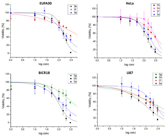 We evaluated the cytotoxic efficacy of 17 synthesized 5,12-dihydrodibenzo[b,f][1,4]diazocine-6,11-diones 3a-o on one normal (EUFA30) and three cancerous (HeLa, BICR18, U87) cell lines at concentrations between 1 and 300 µM (Figure 5). Among the tested compounds, five: 3f, 3g, 3h, 3n, and 3o, showed cytotoxic effect at the same time maintaining the selectivity of action –– their IC50 ranged from several dozen (lowest: 93.7 µM) to several hundred (highest: 322.8 µM). Nevertheless, the IC50 for the normal cell line was higher than for the cancerous one. For the majority of the remaining compounds, IC50 values were above the highest concentration used (Table 3).