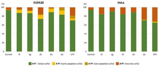 The HeLa cells were sensitive to all tested compounds with a significant increase in necrotic phase only. After 24 h, the number of necrotic cells for 3f, 3g, 3h, 3n, and 3o were 15.3, 8.8, 15.3, 11.3, and 27.7%, respectively, in comparison to 5.4% in the non-treated control. The best cytotoxic agent appears to be 3o, the compound that killed cells similarly to CPT, a positive control with 31.2% of necrotic cells.